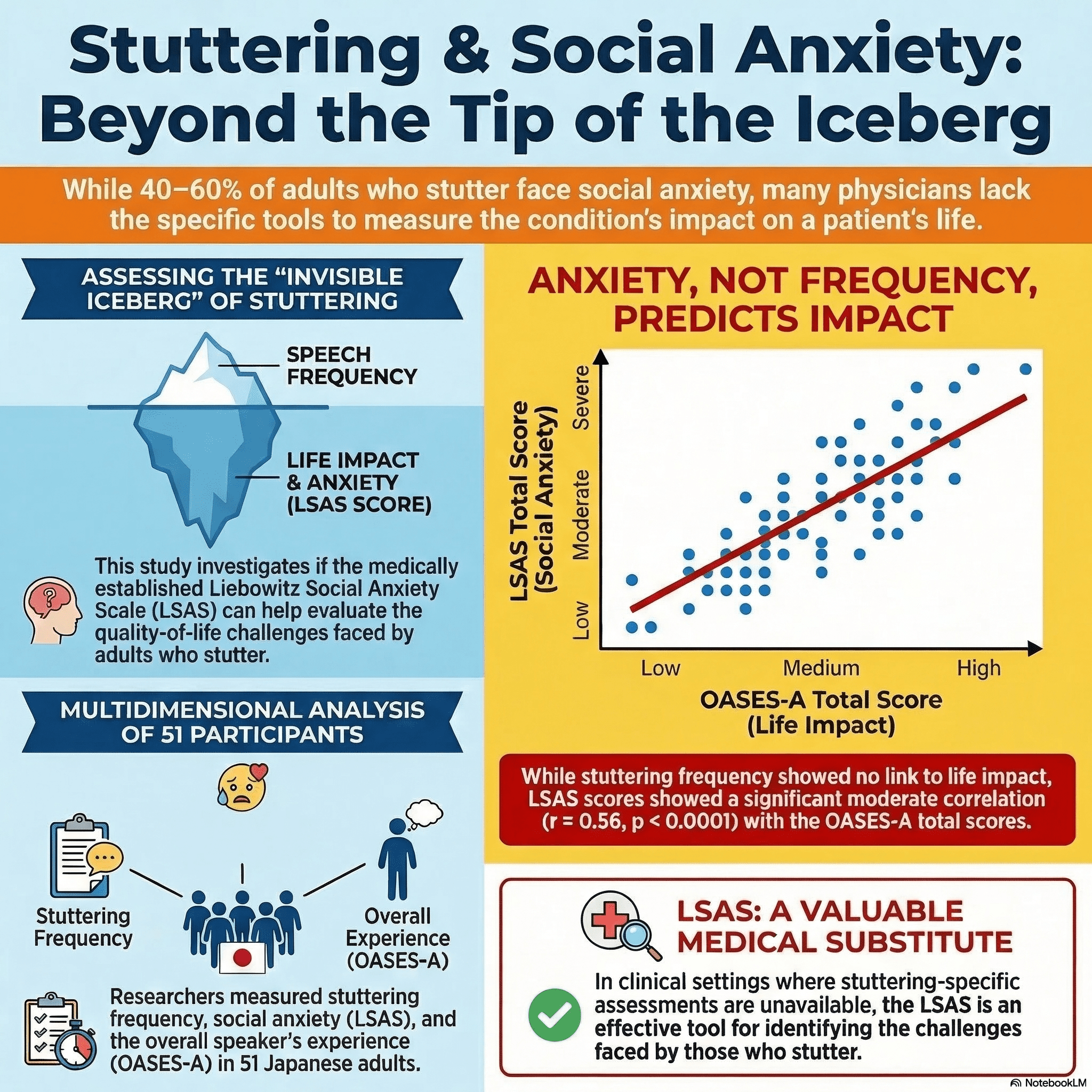 Stuttering is often described as an “iceberg,” where the visible speech disruption is only one part of a much broader experience. For many adults who stutter, the greater burden may lie in the hidden effects on daily life, confidence, and mental health. In this study, our team examined the relationship between stuttering frequency, overall life impact, and social anxiety in 51 Japanese adults who stutter.